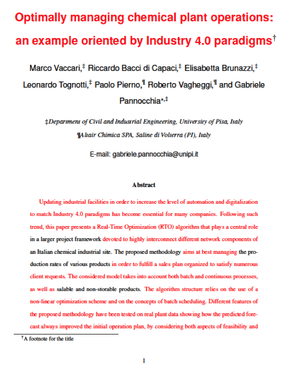 La collaborazione con UNIPI, Dipartimento di Ingegneria e Chimica industriale (DICI), ha fatto nascere anche una pubblicazione internazionale: “Optimally managing chemical plant operations: an example oriented by Industry 4.0 paradigms” (M.Vaccari, R.Bacci di Capaci, E. Brunazzi, L.Tognotti, P.Pierno, R.Vagheggi, G.Pannocchia in Proceedings of 21st IFAC World Congress, Berlin, 2020).