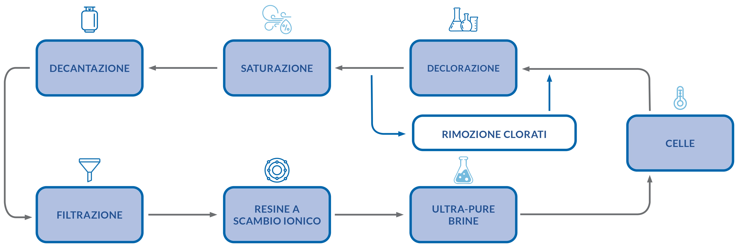 L’impianto è in grado di distruggere tutta la quantità del composto di clorati KCIO3 durante l’elettrolisi della salamoia KCI: agendo sulla materia prima (la salamoia) si purifica il suo prodotto finito (KOH).