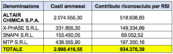 Di seguito il prospetto dei costi ammessi e del relativo contributo riconosciuto: