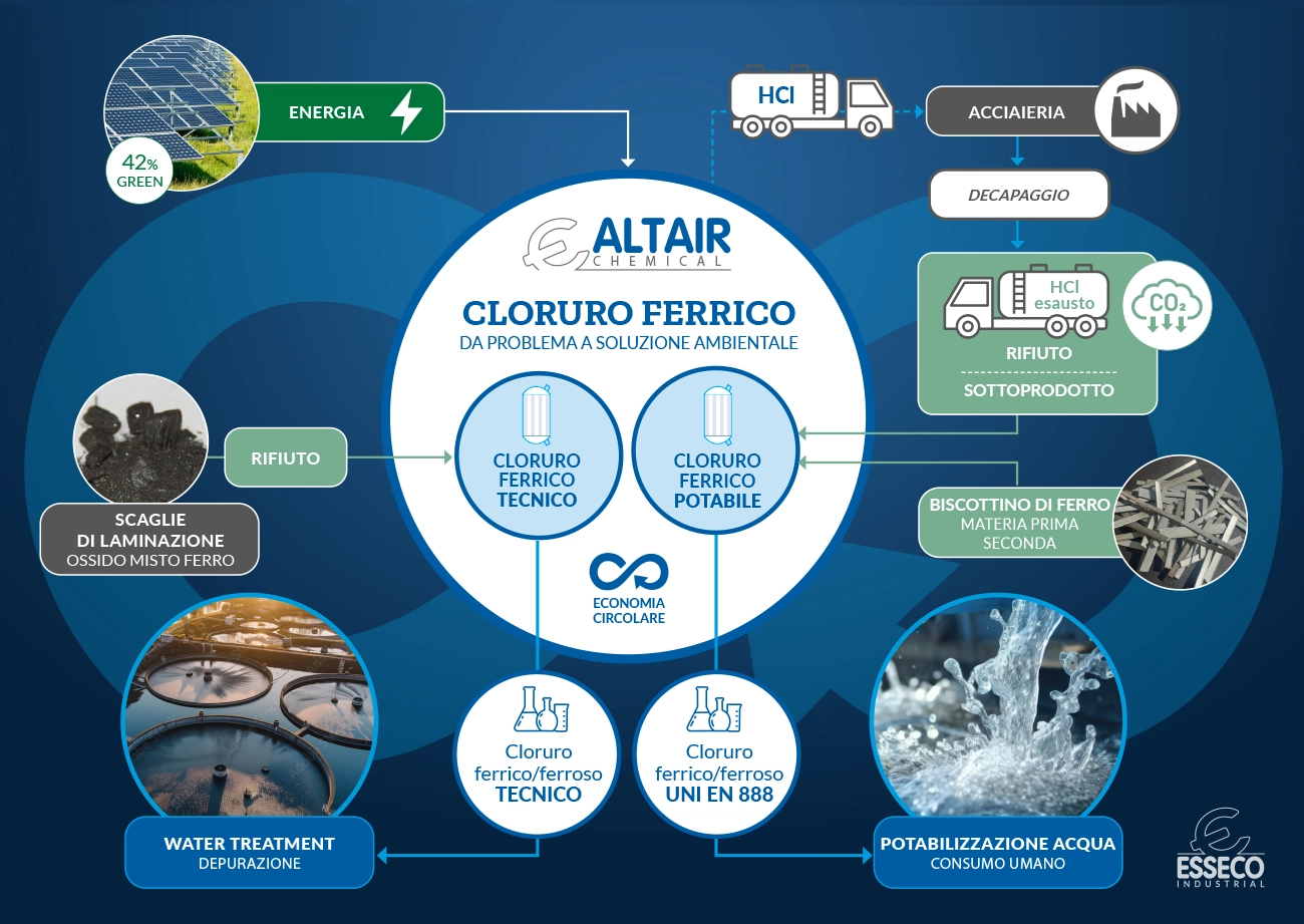 Parallelamente, vengono recuperate le scaglie di laminazione provenienti dalla lavorazione del ferro, utilizzate come materia prima per la produzione di cloruro ferrico grado tecnico.